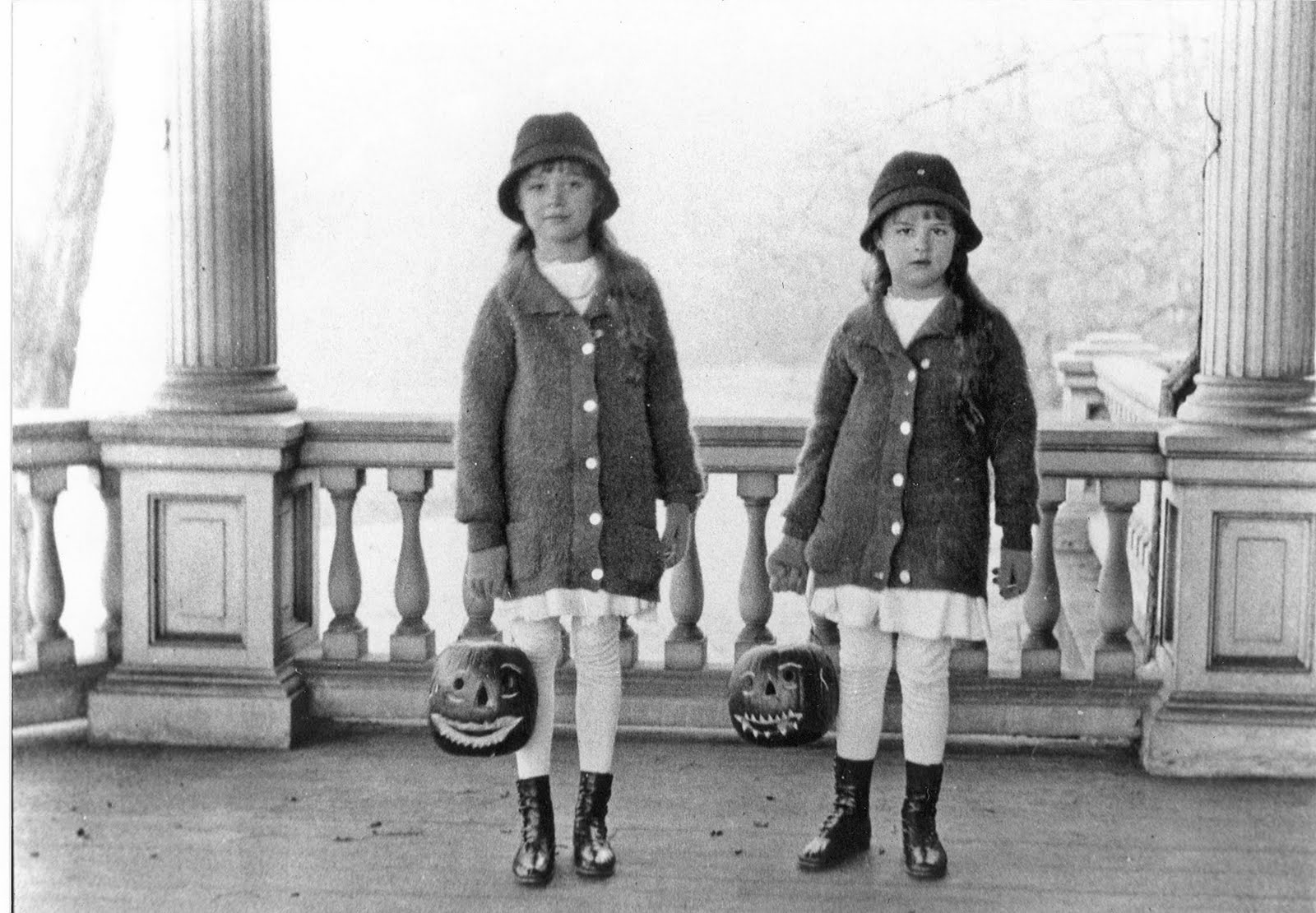 It was not until the 1920s when Halloween as we know got into full swing with parties, costumes, ghosts, witches, pirates, and gypsies (trick-or -treating had to wait until the 1930s though). Elaborate parties for both children and adults became popular. Community parties, often hosted at the town hall or fire hall, also became popular–in part to discourage any more pranks from young boys. These community parties were popular for decades to come. I can still remember the volunteer fire department in my little Maine town holding a costume contest and passing out cupcakes and candy apples every year during my own childhood in the 1980s.Although we do not have any evidence of Halloween parties being thrown at Clermont, we do have a few pictures that indicate that the Livingstons recognized the holiday in some way. Both show Janet and Honoria showing off freshly-carved Jack o\’ lanterns. One is from the mid 1910s, the other is from mid 1920s, when they were in Italy. Given than Alice enjoyed entertaining and the girls enjoyed playing dress-up, we are willing to extrapolate a little and show the mansion decorated in historic fashion for Halloween.