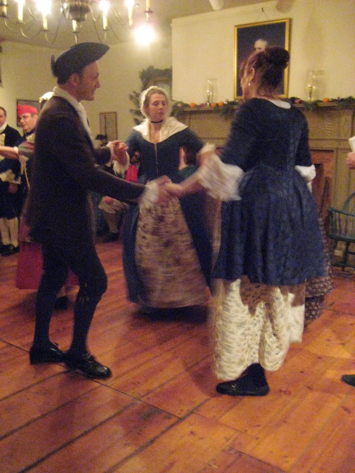 These experienced musicians are lifelong students of living history and bring flare and fun to historical inquiry. I had the chance to dance with them in January at a Twelfth Night party. It took me only a couple of songs to pick up the basics, and pretty soon I was having a really good time (that\’s me down below in the green dress with the goofy look on my face). I was so sorry when the night was over that I knew that I just had to have them perform at Clermont as soon as the opportunity arose.