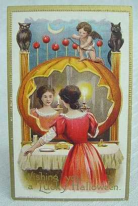By far my favorite pieces of memorabelia from early 20th century Halloweens however are the post cards. First imported to the United States in the first decade of the 20th century, these cards provide a rich source for information, inspiration, and even use in decoration. They depict the scarey, romantic (yes, romantic), mysterious, and nostalgic sides of Halloween. Last year, I scanned and printed some to serve as place