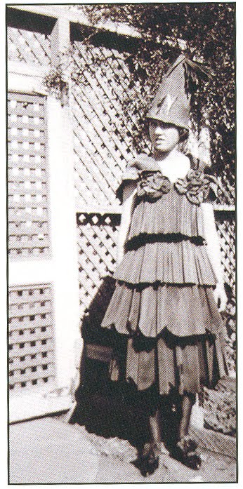 In the \”Bogie Books,\” brightly-colored crepe paper showed up in the not only as pretty streamers, but as costumes! As you can see from the photo at right (taken from Diane Arkins\’ book Halloween Merrymaking), whole costumes were constructed by mounting brightly-colored crepe paper onto a simple cotton dress, slip, or even pajamas. Personally, this always struck me as ironic for a holiday associated with games that involved a lot of candles. Few disaster stories have been passed down to us however, leading me to believe that somehow people managed to keep their costumes and their candles far enough apart.