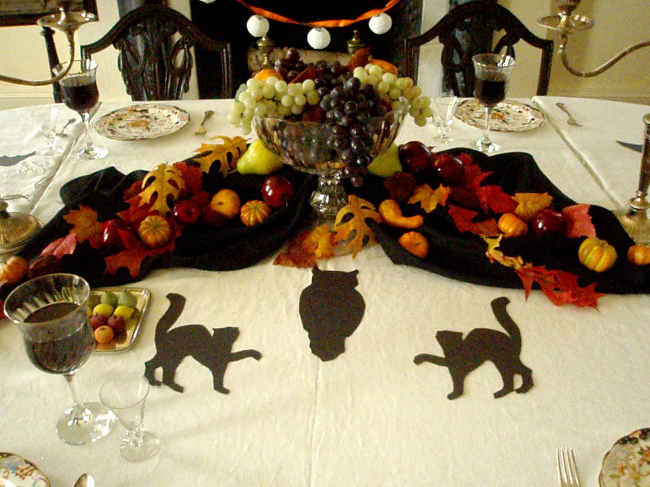 The silhouettes found their way back to the curtains and the table cloth in the dining room, and crepe and tissue paper streamers adorn the library. I also posted an image of the paper chandelier (finished) you can see me working on in the Picture of the Week this week.