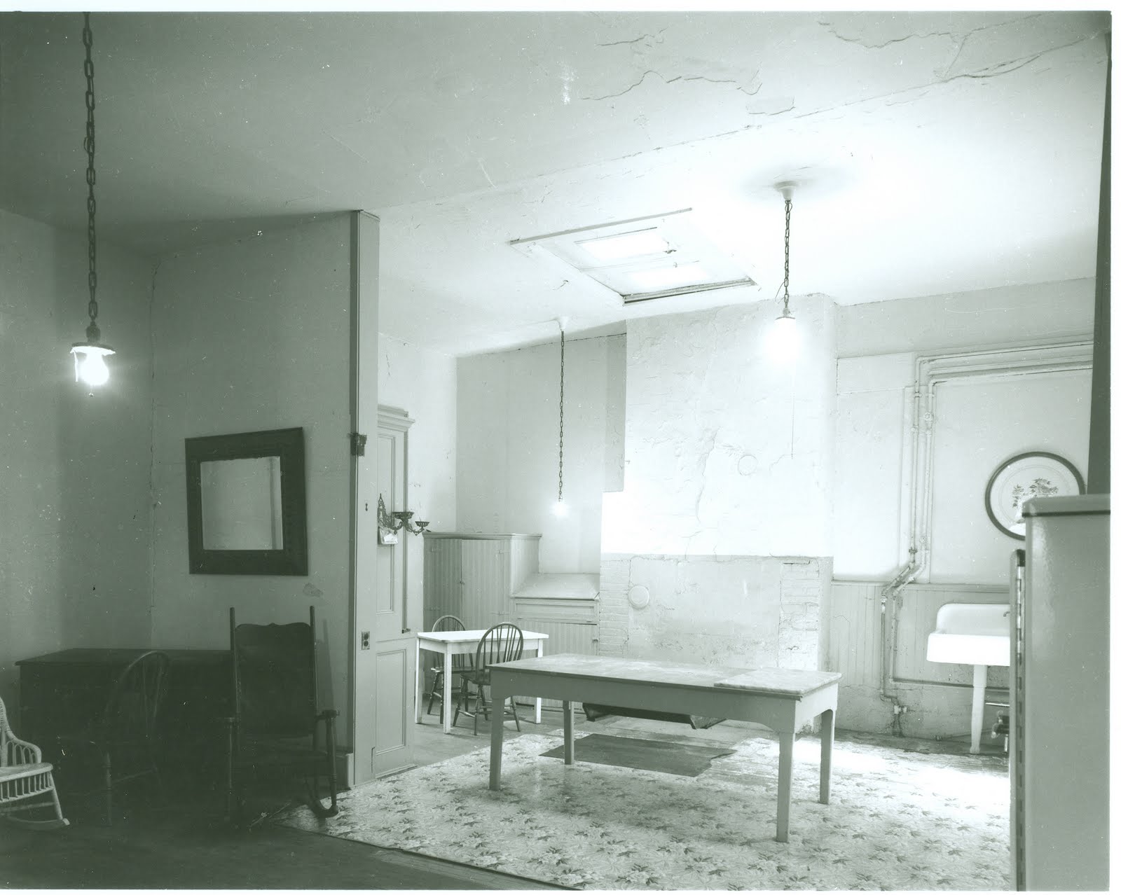 The photo above shows Clermont\’s kitchen in 1965, shortly after we received the mansion from Alice Livingston. Those three hanging fixtures are a blessing on a dark day for me; I can only imagine how much the cook appreciated them. But you can still see kersone lamps affixed to the walls. I do not know whether these were a hold-over from the pre-electricity days or meant as a back-up lighting source in case of power outages. You might also notice that our notoriously dark kitchen (in the north wing) had a skylight added in the middle somewhere around the 1860s. Apparently lighting this space has always been a bit of a chore.