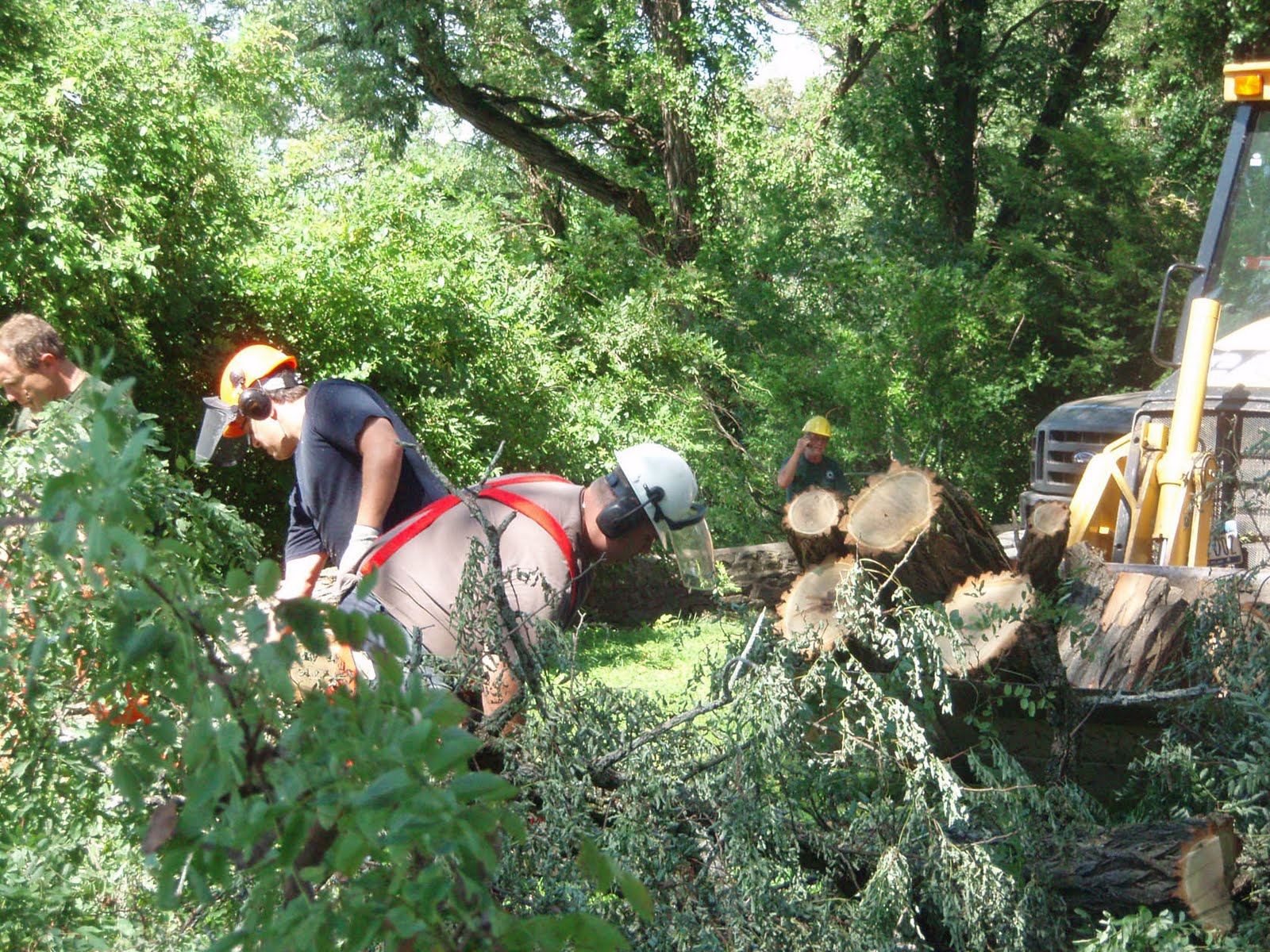 When the tree count was in, we found 150 trees were downed throughout the property, but by some small miracle, not a single one had landed on any of our houses or auxiliary buildings. Nevertheless the skilled work required to remove some of those trees (especially the catalpa) meant we needed help. And after three days of moving trunks as big as four feet in diameter, our guys were tired and needed more hands!