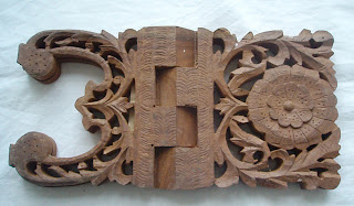 Textiles were not the only thing imported from India. I also came across this pretty carved wooden stand, complete with a big paper label proclaiming \”hand made in India\” (which to me pretty much guarantees that it was purchased in the US or at least not in India proper). The hinge in middle allows the two identical pieces to fold outward, forming an X, and the arched piece at the left becomes the feet.