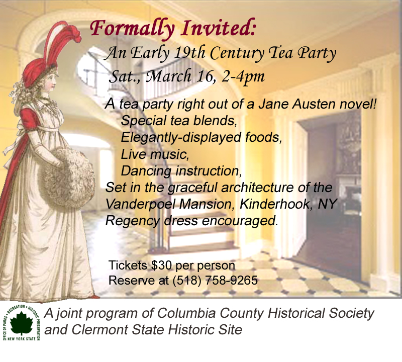 And I\’m sure some people out there are wondering: \”Where are these Jane Austen Parties? How do I play along?\” Or at least some of us at Clermont were thinking that. That\’s the good thing about being a museum, we are perfectly placed to make your dreams of becoming Elizabeth Bennet for an afternoon come true. This was part of how we hatched the idea to work with our good friends at Columbia County Historical Society to create the Formally Invited Tea Party on March 16th (2013).