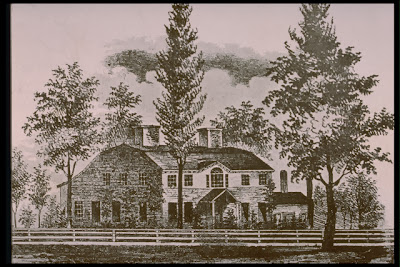 A large and commodious house, its brick-and-stone hulk conformed to fashionable standards of the day, and it was located between two picturesque lakes. Unfortunately for us, it was demolished in 1895 after lying derelict for many years, but the nostalgia of the Colonial Revival in the early 20th century lead to foggy recollections of its former glamor. It seems to have been built basically along a Georgian floor plan with a center hall. However, while one side was divided into the usual two front and back rooms, the other (the north side) appears to have been one long, wood-paneled room from front to back. By 1900, this was romantically referred to as a \”ball room,\” but it would likely have served other purposes as well (how many \”balls\” can one family throw in a year–enough to merit a whole room in the main part of their house?). At any rate, such a large room may well have been closed off for the winter as it would have proven very difficult to heat with a single fireplace, especially with its large windows and high ceilings, as they are described.