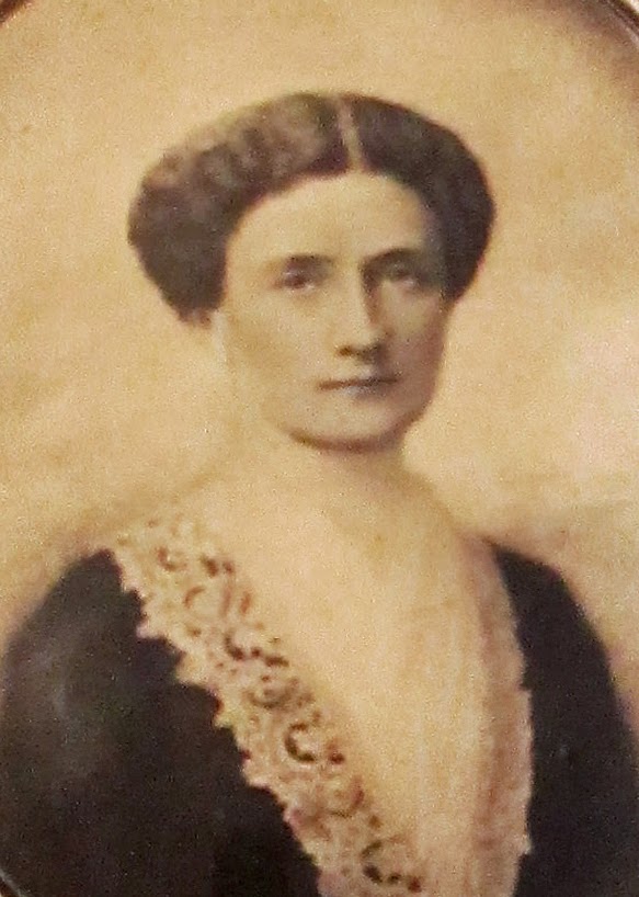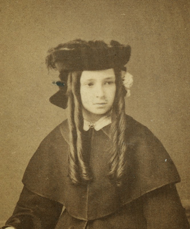 Her mother appears to be about the same age when her photograph was taken, maybe a year or two older, although the caption in our archives has her labeled as 16. She is wearing a large coat with sloped shoulders in a popular silhouette for the 1850s, and her shorter skirt (just ankle length) is held out by a nicely rounded hoop. Her big sausage curls suggest that instead of braids, she slept last night in rag curls.