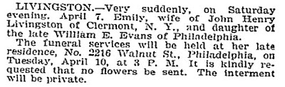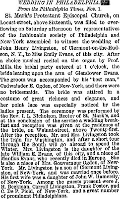 It was while doing newspaper research for John Henry Livingston that I came across a few tantalizing tidbits of Emily\’s life. First of all, there was the wedding announcement for John Henry and his new wife in the New York Times on November 3, 1880.