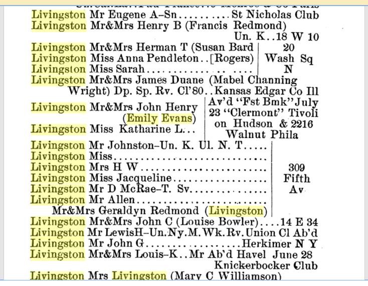 Then, a reference to \”Mrs John Henry Livingston\” assisting Katharine (her step daughter) at her society debut, just months after the family had returned from Europe in 1892.