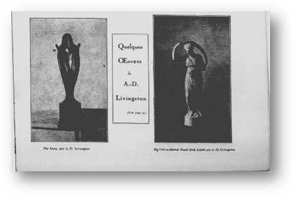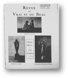 In July of 1928, Revue du Vrai et du Beau published a short article on a selection of sculptures by Alice D. C. Livingston accepted for display at the Pennsylvania Academy of Fine Arts that year. Although relatively short, this is the only published piece we have been able to find on Alice’s work and her exhibition history as an artist. Finding any publication on her work, especially one contemporary to the time in which she was actively making and showing her sculptures, is fortunate considering she was a self-taught artist and came into her visual art practice later in life. From oral histories as well as her own recollections and albums, we know that Alice began to sculpt in 1925 at the age of 53, at which point her two daughters were in their mid-teens. Revue notes this, stating that her late start in sculpting, or “modeling,” was due to her occupation with society and family. Interestingly, rather than labeling her an amateur, they praise her work as original because of the unique viewpoint and technique she developed through the process of teaching herself to sculpt. This is unusual in that her seemingly marginal position as someone who was not trained within the conventions of the academy is viewed as a strength rather than an indication of inferiority: “…all figures [have] an intensity of life, a purity of lines, a delicacy of model and a harmony of proportion which testify to the virtuosity of talent, in full possession of a very personal technique…Having never had the leisure to take lessons or follow courses, she was her own teacher, hence, no doubt, this note of personal originality that I am pointing out” (Revue, 15, 16).