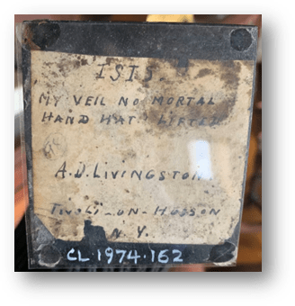 Much of the body of the Revue article is dedicated the bronze figurine pictured and labeled “The Scarp” on the summer edition’s title page. A loose translation of the original French describes the bronze statue, which depicts a draped female figure, as one of “mystical appearance” imbued with spirituality and symbolism: “…so much does the spiritual, the idea, the symbol, dominate…It becomes a soul, lifted towards infinity, the body…is nothing more than a grand envelope for thought” (Revue, 15). Today this statue is on display in Clermont’s library, tucked between an elaborate 19th century candelabrum and an Italian flower urn. Known to Clermont staff as “Isis,” a subject likely influenced by Alice’s appreciation of Egyptian sculpture and line, it cannot be overlooked that this piece is titled differently in the pages of Revue. After examining the physical object itself, I discovered a label affixed to the underside of the base written in Alice’s hand which provided two titles for the statue: “Isis” and “My Veil no Mortal Hand Hath Lifted.” Based on this information, I believe it’s likely that the editors of Revue labeled the photographs of Alice’s statues incorrectly on the title page considering that the sculpture pictured adjacent to the bronze is the one labeled “My Veil no Mortal Hand Hath Lifted.” This second sculpture depicts another female figure draped in a sleeveless dress and winding a long, delicate cloth around herself. Additionally, the bronze in question is referred to in the body of the article as “My Veil….” Taking all of these details into account, I suggest that the title “The Scarp” was intended for the second sculpture and that, possibly, it was supposed to be titled “The Scarf,” in reference to the long, thin shawl that the figure is in the process of wrapping around herself. While we do not retain this particular piece in Clermont’s collection, a framed photograph of it is displayed in a cabinet in Clermont’s study alongside a selection of Alice’s sculptures, including “The Mother,” also pictured in the article and exhibited in 1928.