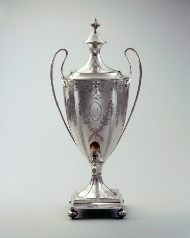John Adams, the second president of the United States, wrote of visiting coffeehouses with his contemporaries, such as Benjamin Franklin, to discuss colonial politics and wrote of the importance of renouncing tea in favor of coffee for the revolutionary effort. In fact, Adams owned an engraved silver-plated urn, very similar to this one owned by the Chancellor, which was, ironically, produced by a British manufacturer in Sheffield. It is said that, although the urn was originally made for tea, Adams likely used it for coffee instead. Interestingly, this urn was also made in Sheffield and used for coffee rather than tea so we can assume that the Chancellor’s attitude towards British commodities and his consumption of coffee throughout the Revolution was at least in part political and in line with Adams’s well-documented views. This choice, especially factoring in the British provenance of the Adams and Livingston coffee urns, further illustrates the trend of consuming specific commodities while eschewing others as a political statement of resistance in America during this time.