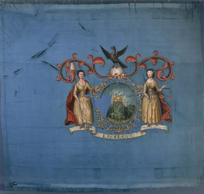 Interestingly there is one regimental flag from a New York Continental Regiment in existence. The flag of the 3rd New York Regiment was given to the regiment in 1779. It bears a striking resemblance to the modern New York state flag.[2]